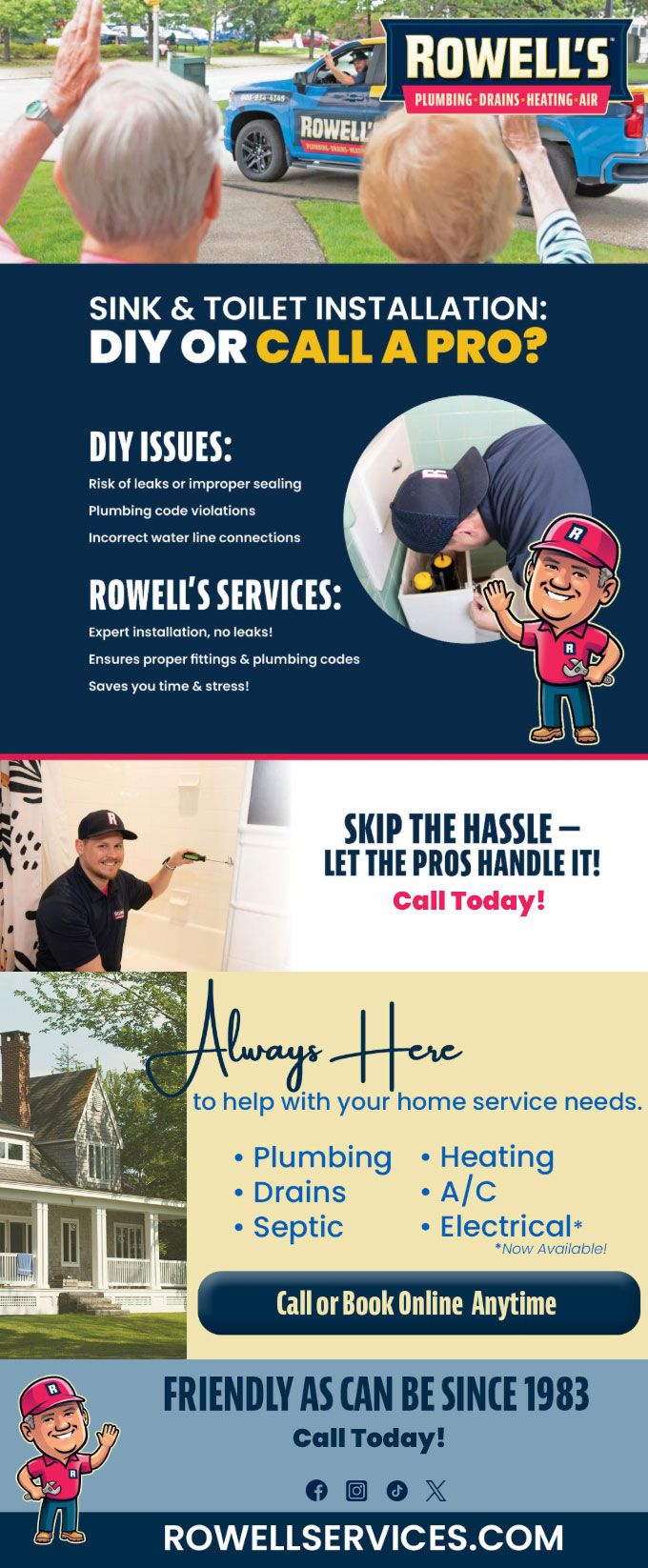 "Friendly As Can Be Since 1983!" When you need help with your plumbing, drains, heating, cooling or electrical in Hooksett, you can always rely on Rowell's Services! Call us now or book online!